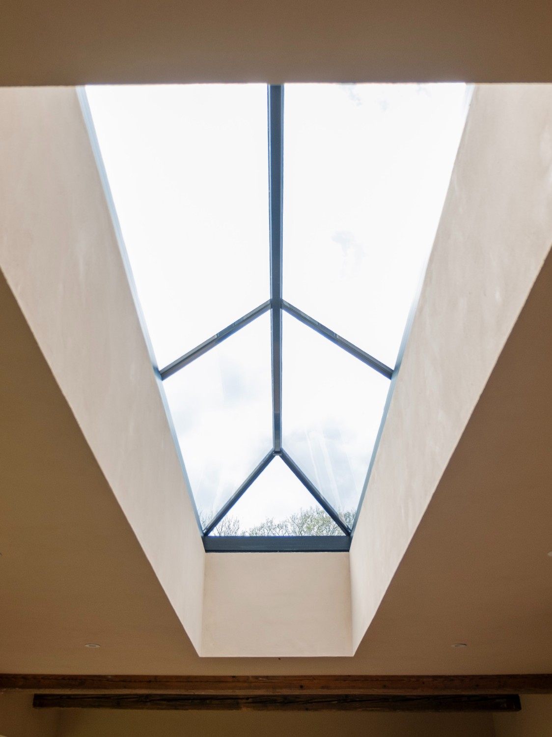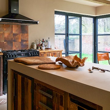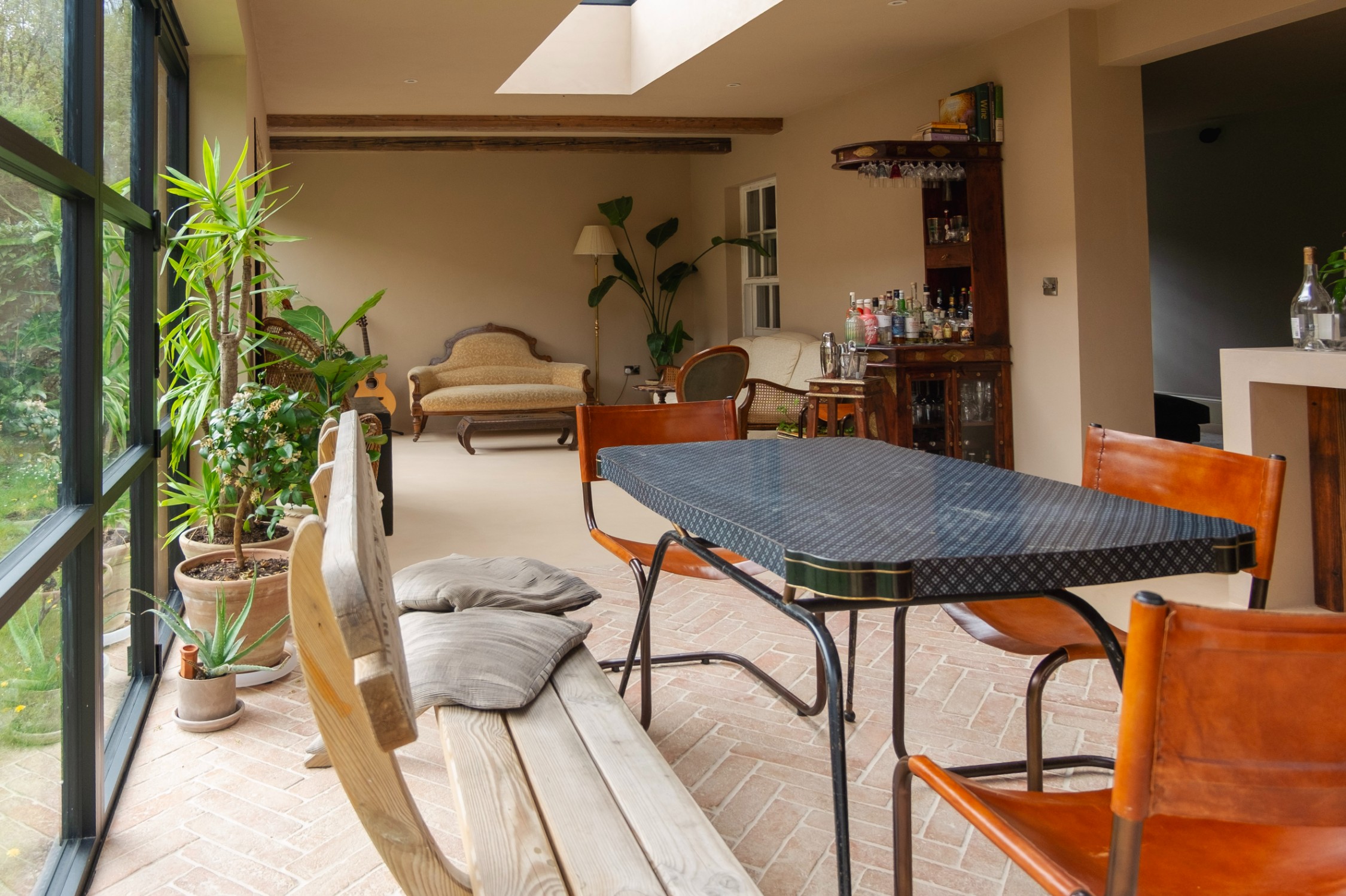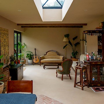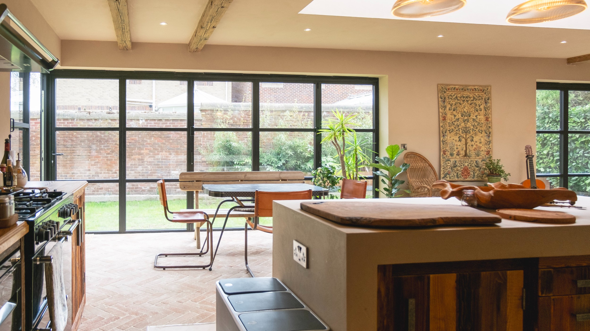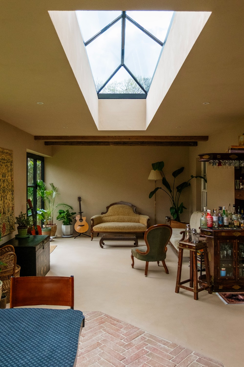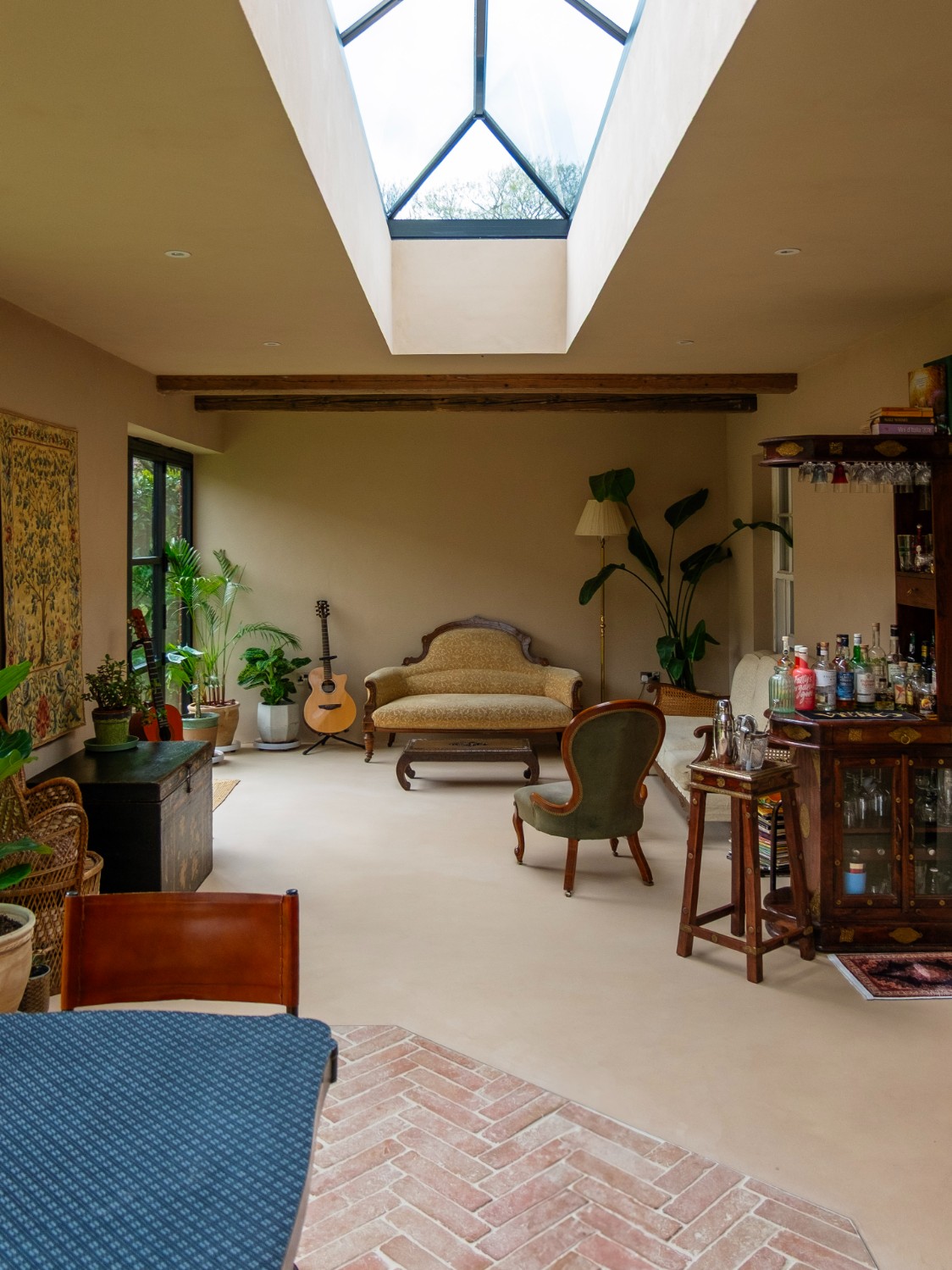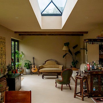 We designed and built a house extension that transformed the kitchen into a spacious open-plan living, dining, and kitchen area with a generous central island. A large skylight floods the space with natural light, while French doors create a seamless connection to the garden.