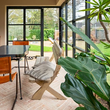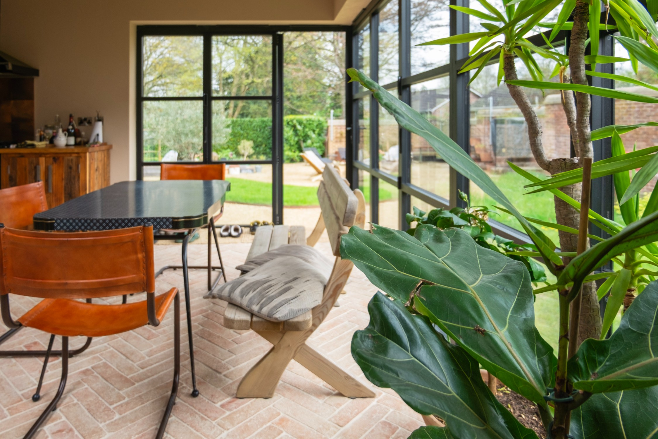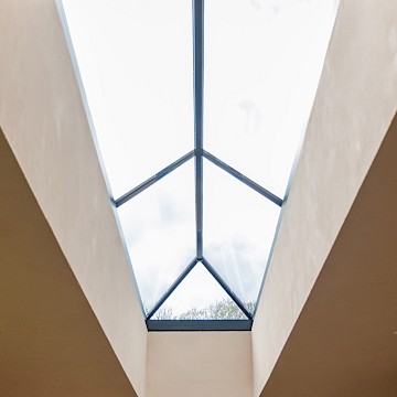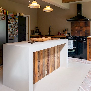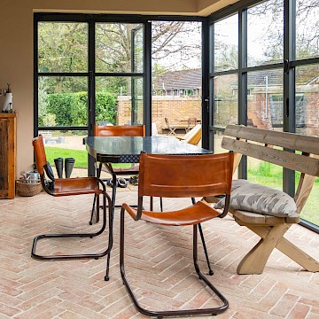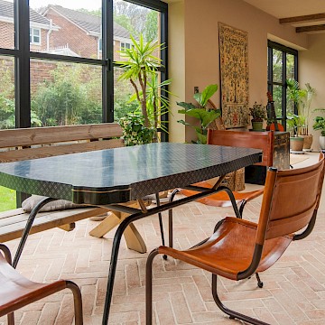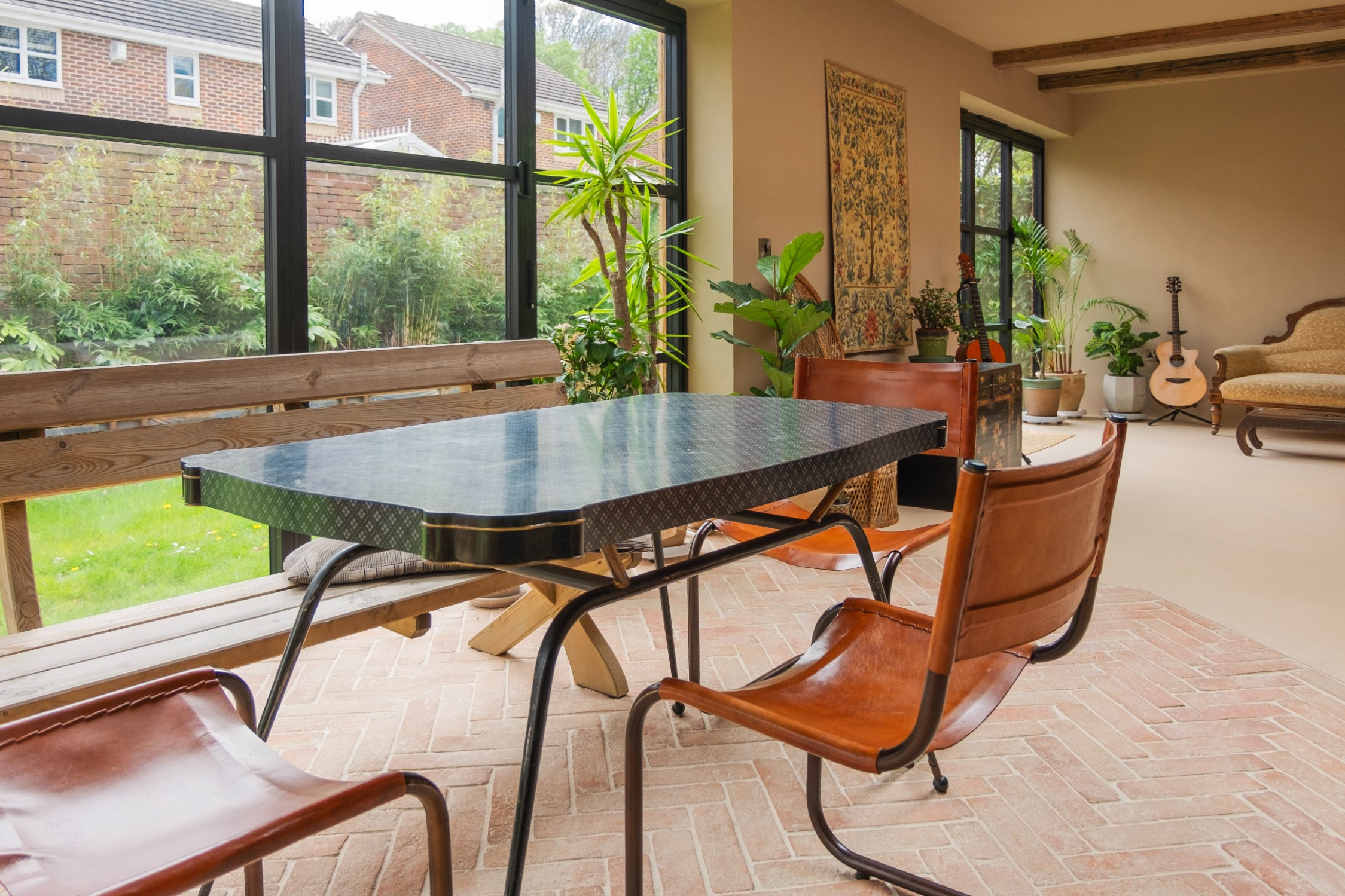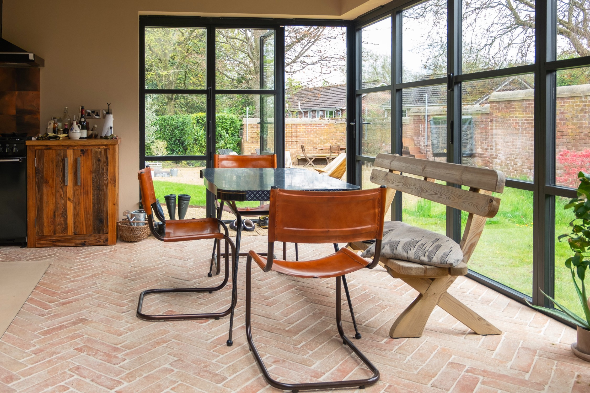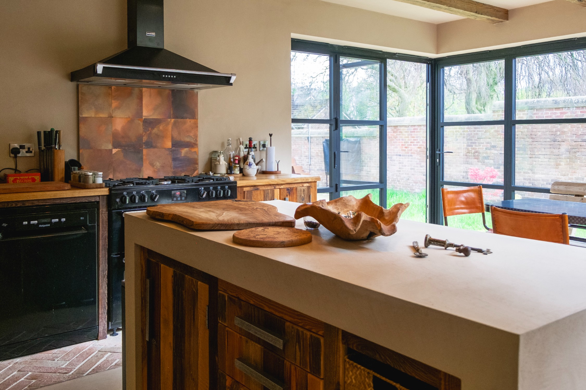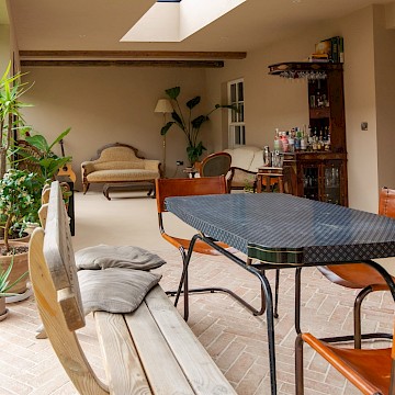 We designed and built a house extension that transformed the kitchen into a spacious open-plan living, dining, and kitchen area with a generous central island. A large skylight floods the space with natural light, while French doors create a seamless connection to the garden.