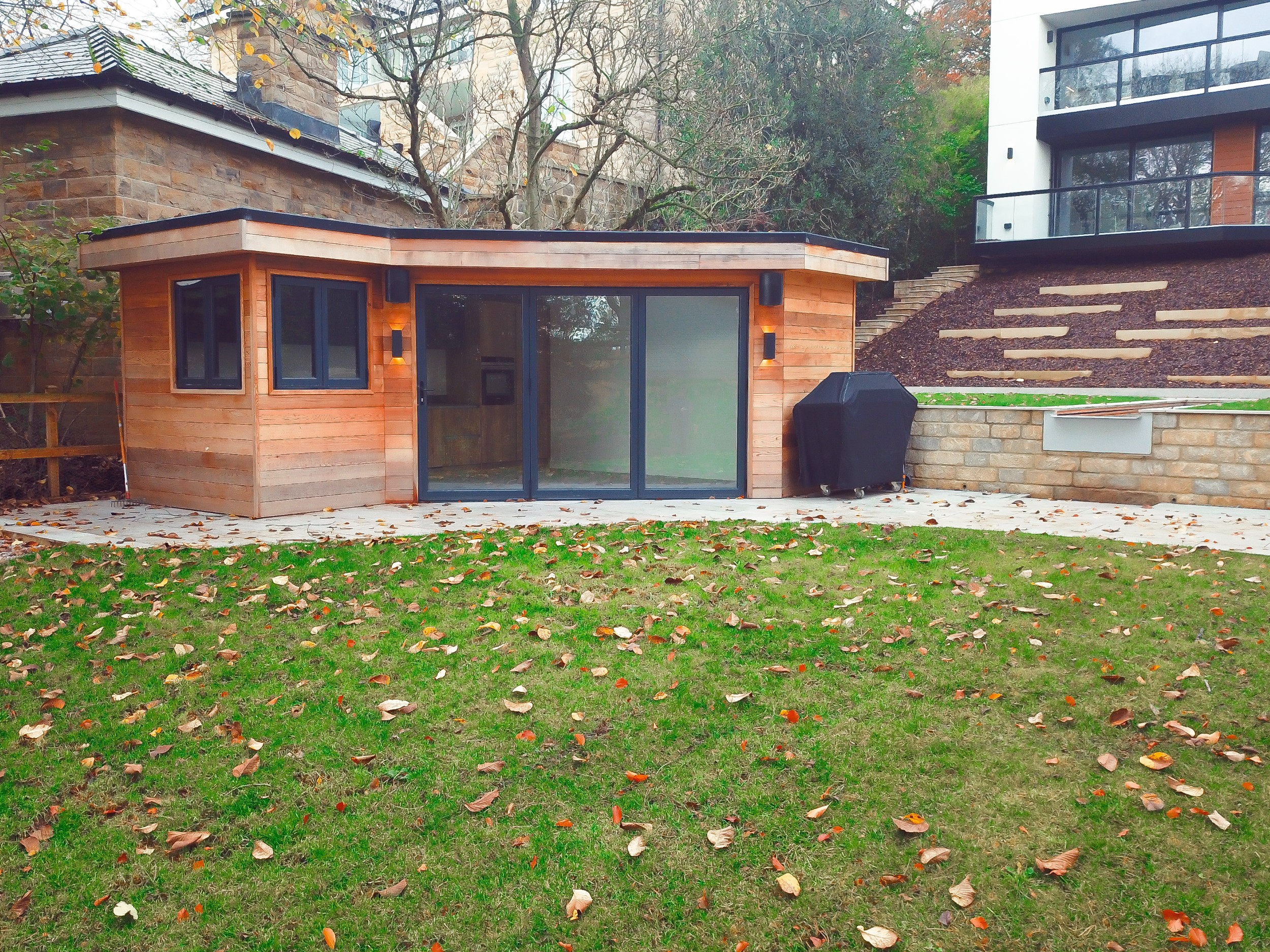 This garden room is clad is Western Red Cedar houses a fully-functioning kitchen.