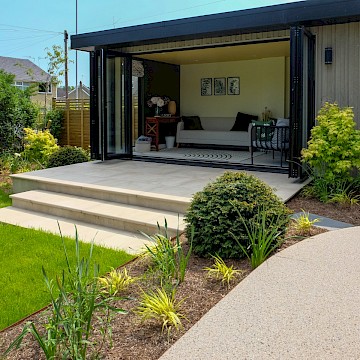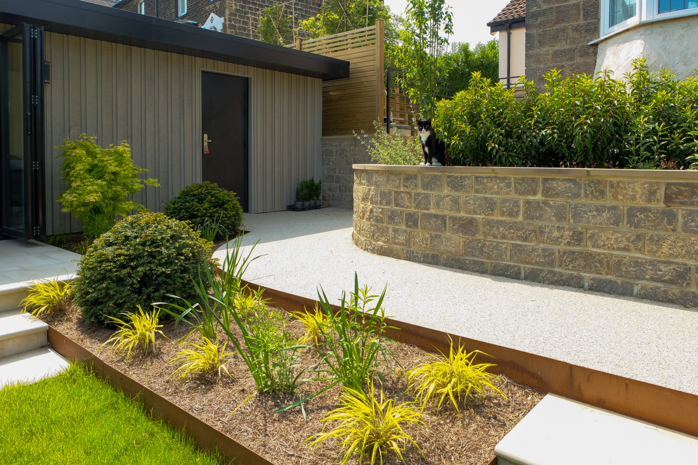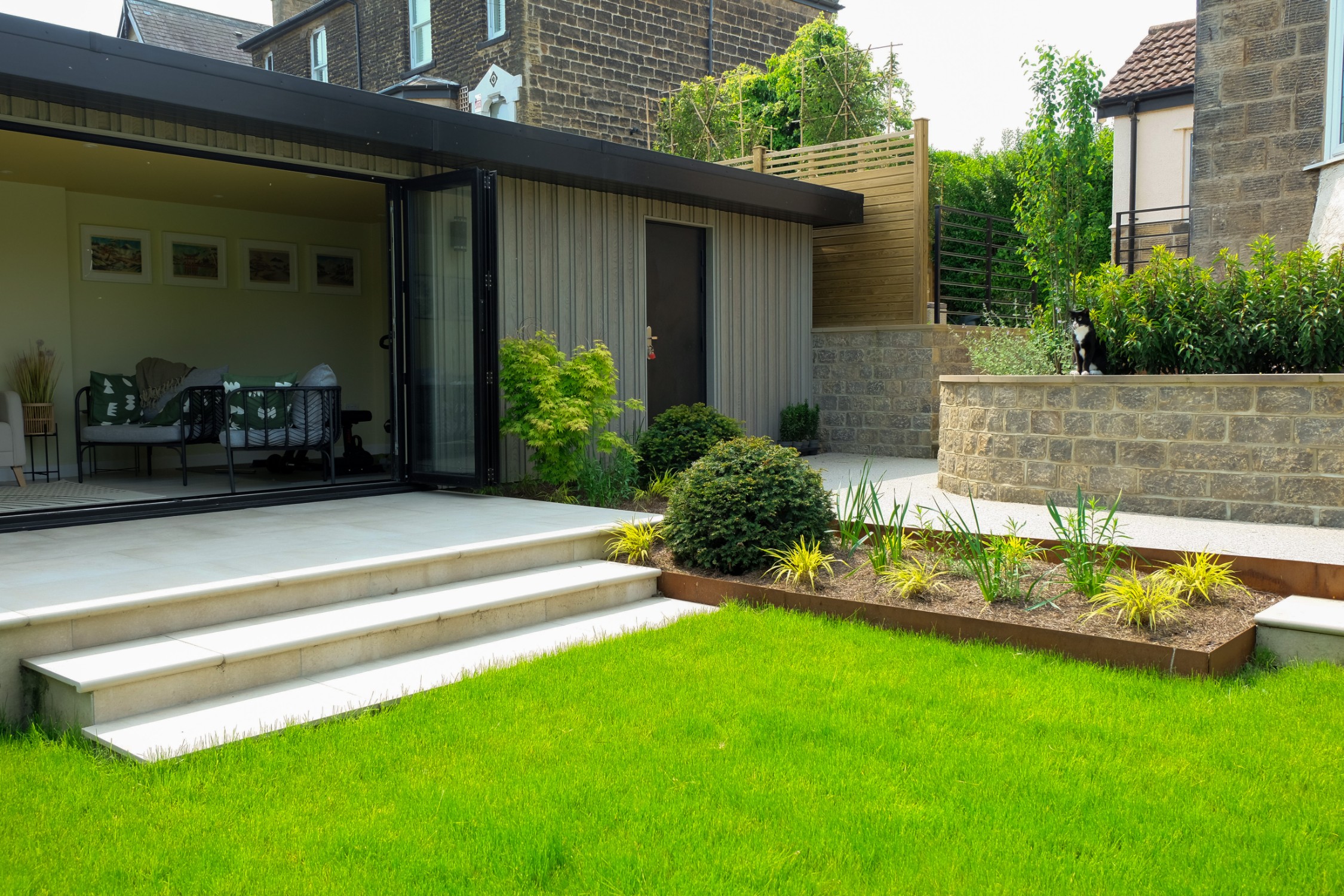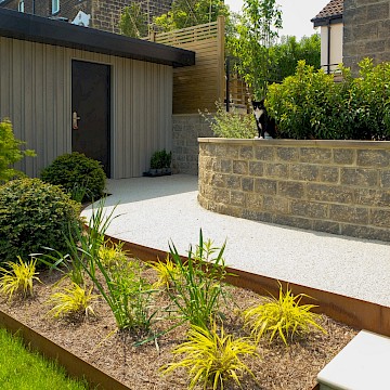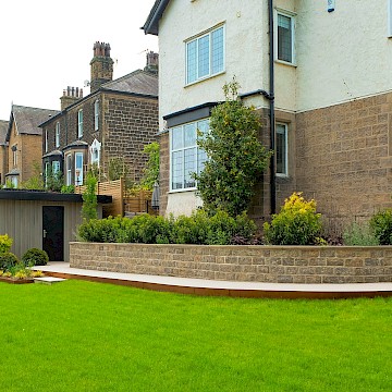 For this project, we collaborated with garden designer Melissa Morton to transform this large garden space in Menston. A small garage was demolished to make way for a bespoke garden room, fully serviced and plastered for year-round use. Throughout the garden, we constructed Yorkshire stone walling and gabion baskets, adding both structure and character. A composite decking seating area, complemented by Jacksons Fencing, creates a stylish and durable outdoor space, while pleached trees provide privacy and shelter.